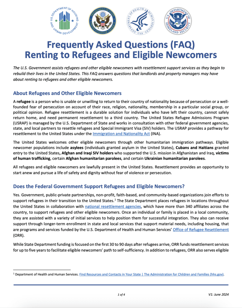 This resource, authored by the Office of Refugee Resettlement (ORR) in collaboration with the Bureau of Population, Refugees, and Migration (PRM), the U.S. Department of Housing and Urban Development (HUD), and the U.S. Department of Homeland Security (DHS), addresses the crucial topic of renting to refugees and other eligible newcomers. Developed in response to a request from national resettlement agencies, this Fact Sheet aims to inform and support landlords and property managers in their decision-making processes.