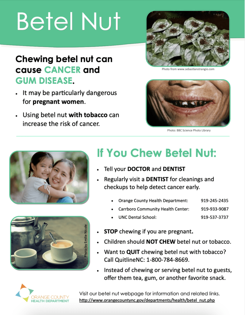 Betel nut is the seed of an areca palm that grows in tropical parts of the Pacific, Asia and eastern Africa. It is said to have both stimulant and relaxation effects and is often used as a digestive aid or to sweeten breath. This resource, developed by Orange County North Carolina, warns of the dangers of chewing betel nut.