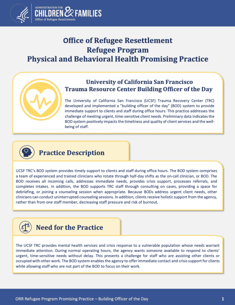 The University of California San Francisco (UCSF) Trauma Recovery Center (TRC) developed and implemented a “building officer of the day” (BOD) system to provide immediate support to clients and staff during office hours. This practice addresses the challenge of meeting urgent, time-sensitive client needs. Preliminary data indicates the BOD system positively impacts the timeliness and quality of client services and the well-being of staff.