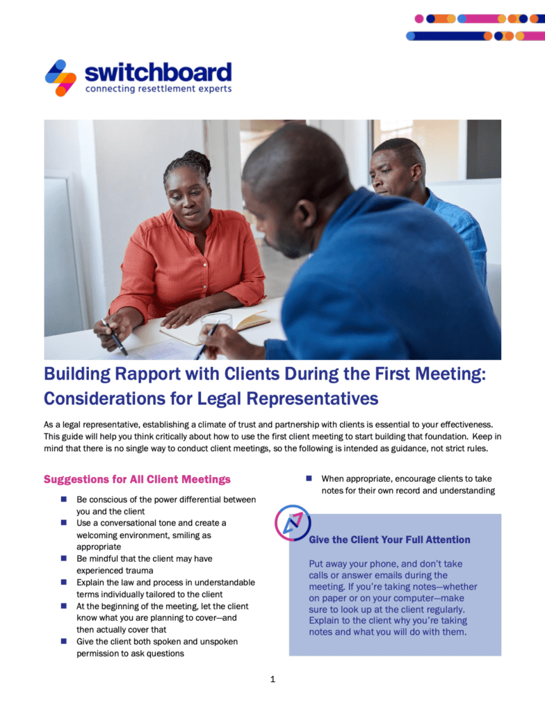 As a legal representative, establishing a climate of trust and partnership with clients is essential to your effectiveness. This guide, developed by Switchboard in partnership with VECINA, will help you think critically about how to use the first client meeting to start building that foundation. Keep in mind that there is no single way to conduct client meetings, so the following is intended as guidance, not strict rules.
