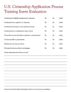 This evaluation form can be used to assess attendee learning and collect feedback about your community outreach event on the citizenship application process. It is available in English, Arabic, French, Nepali, Somali, and Spanish. This tool is part of the CLINIC Citizenship Toolkit. For more multilingual citizenship education materials, see the complete Citizenship Toolkit, comprising the Citizenship Navigator Training Guide and associated zip files.
