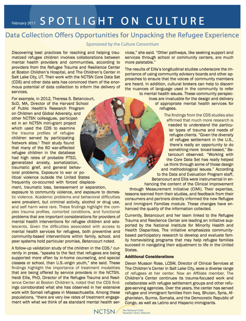 This tip sheet outlines use of data for discovering best practices for reaching and helping traumatized refugee children that involves collaborations between mental health providers and communities. It also describes how, for a few different NCTSN centers, data sets have convinced them of the enormous potential of data collection has to inform the delivery of services.