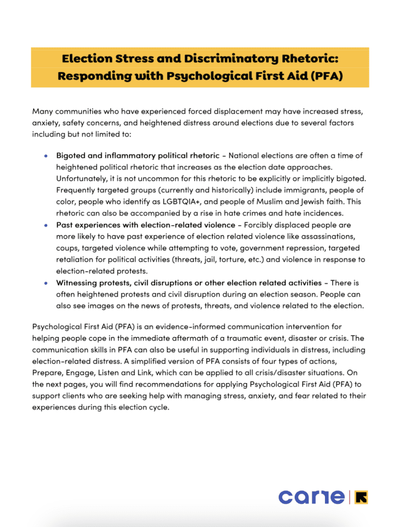 In response to the recent increase in discriminatory rhetoric, threats, and general unrest surrounding the 2024 U.S. Presidential Elections, CARRE has created a guidance note with tips and resources for providers to provide support and information to clients who many be experiencing distress.