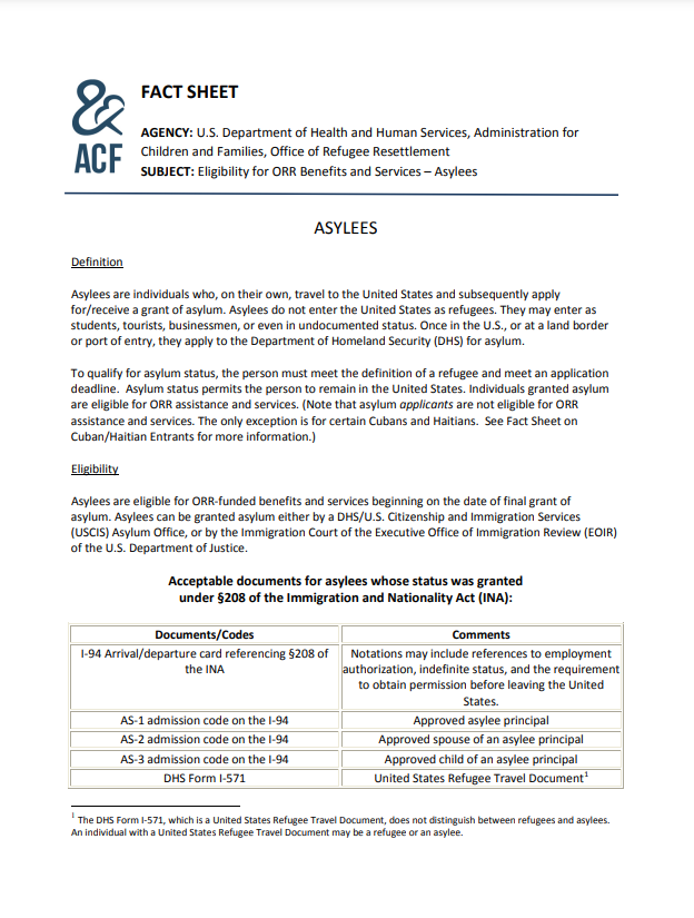 These fact sheets, developed by the Office of Refugee Resettlement, provide information on ORR eligibility for selected populations. These fact sheets include information on asylees, Cuban & Haitian entrants, refugees, special immigrant visa holders, survivors of torture, and victims of trafficking.