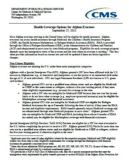 Afghan evacuees arriving in the United States will be eligible for health coverage through Medicaid, the Children’s Health Insurance Program (CHIP), the Health Insurance Marketplace, or refugee medical assistance (RMA or other health coverage provided by the Office of Refugee Resettlement (ORR)). RMA is provided through the Administration for Children and Families (ACF) and administered in most cases by state Medicaid programs. Eligibility for each coverage program depends on the state where an evacuee is residing and the eligibility criteria for the respective program.
