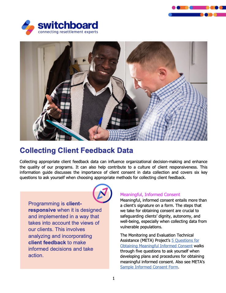 Collecting appropriate client feedback data can influence organizational decision-making and enhance the quality of our programs. It can also help contribute to a culture of client responsiveness. This information guide discusses the importance of client consent in data collection and covers six key questions to ask yourself when choosing appropriate methods for collecting client feedback.