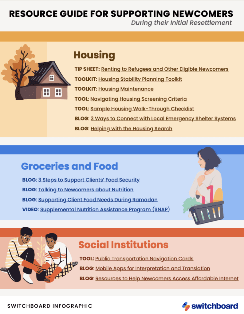 Newcomer adjustment depends on countless individual and systemic factors, and feeling empowered in accessing services in a new community is an essential indicator of success. Newcomer service providers can play a major role in supporting newcomer access to resources in their communities, but it can be tough to know where to start in addressing the many barriers newcomers face in fully taking advantage of what is available to them. This infographic serves as a training-based community resource map for service providers promoting newcomer support across common focus areas. Service providers, community sponsors, and volunteers are encouraged to explore these core resources that can inform their community engagement efforts and provide tools to use directly with newcomer clients they serve.