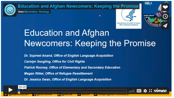 The U.S. Department of Education’s Office of English Language Acquisition (OELA) in collaboration with the U.S. Department of Health and Human Services’ Office of Refugee Resettlement (ORR) presented this webinar about ORR’s process for placing and supporting Afghan refugees in the context of the U.S. educational system. The webinar also featured representatives from the Office for Civil Rights (OCR) and the Office of Elementary and Secondary Education (OESE).