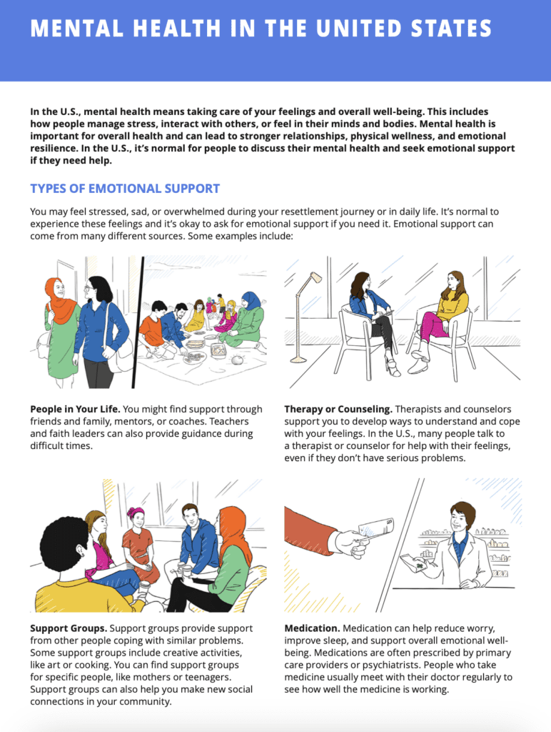 In this fact sheet by Settle In, readers will explore the significance of mental health in the U.S. and its impact on overall well-being. The video addresses how mental health influences daily life, relationships, and emotional resilience, particularly during the resettlement journey.