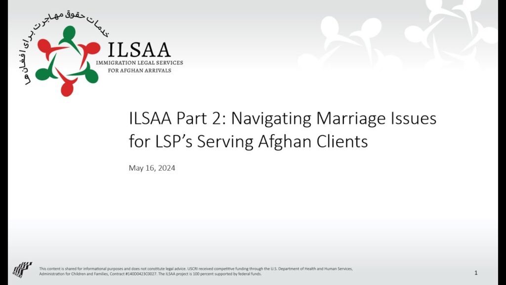This recorded webinar is the second in a two-part series that covers the common marriage-related issues facing Afghan arrivals seeking family reunification. In part one of this series, legal service providers (LSPs) can learn about family law in Afghanistan and how best to conduct interviews that address marriage-related issues. Part two covers the common issues that Afghan clients face and the immigration consequences that those issues present. These topics include marriage by proxy, underage marriage, and polygamy.