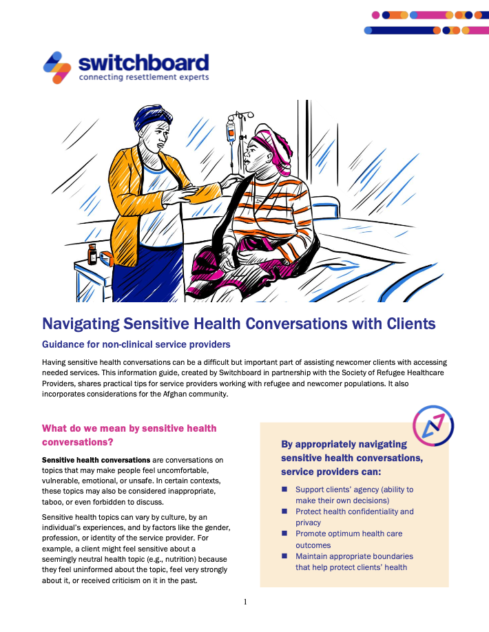 Having sensitive health conversations can be a difficult but important part of assisting newcomer clients with accessing needed services. This information guide, created by Switchboard in partnership with the Society of Refugee Healthcare Providers, shares practical tips for service providers working with refugee and newcomer populations. It also incorporates considerations for the Afghan community.