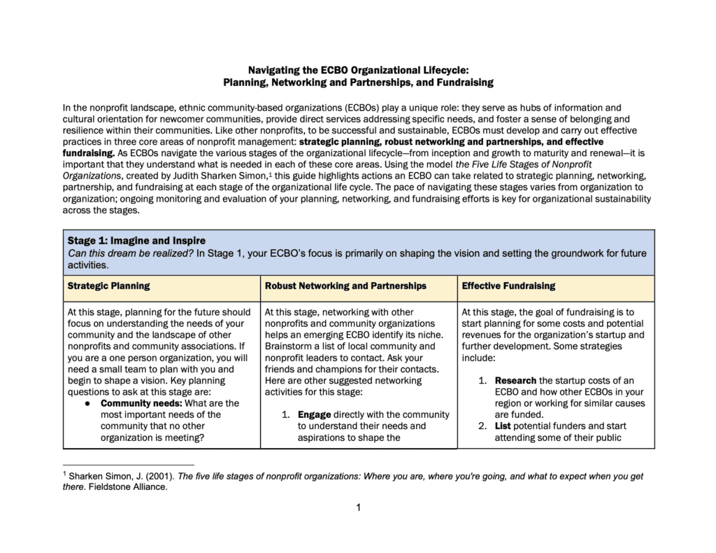 In the nonprofit landscape, ethnic community-based organizations (ECBOs) play a unique role: they serve as hubs of information and cultural orientation for newcomer communities, provide direct services addressing specific needs, and foster a sense of belonging and resilience within their communities. Like other nonprofits, to be successful and sustainable, ECBOs must develop and carry out effective practices in three core areas of nonprofit management: strategic planning, robust networking and partnerships, and effective fundraising. As ECBOs navigate the various stages of the organizational lifecycle—from inception and growth to maturity and renewal—it is important that they understand what is needed in each of these core areas. Using the model the Five Life Stages of Nonprofit Organizations, created by Judith Sharken Simon, this guide highlights actions an ECBO can take related to strategic planning, networking, partnership, and fundraising at each stage of the organizational life cycle. The pace of navigating these stages varies from organization to organization; ongoing monitoring and evaluation of your planning, networking, and fundraising efforts is key for organizational sustainability across the stages. This resource, created by Switchboard, serves as a guide for ECBOs navigating these stages.