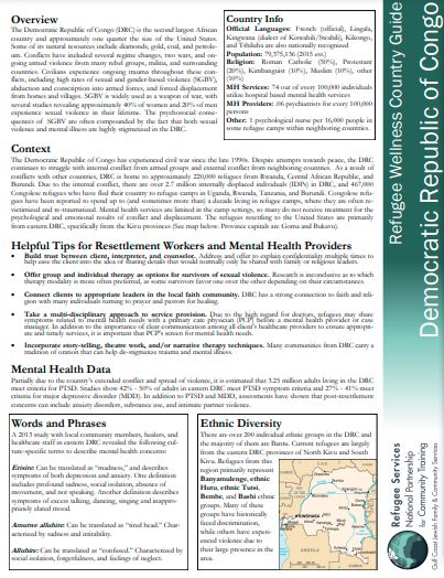 This guide offers information on the mental health considerations, healthcare, beliefs, customs, language and history of the Democratic Republic of Congo (DRC). The DRC is the second largest African country and approximately one quarter the size of the United States. Some of its natural resources include diamonds, gold, coal, and petroleum. Conflicts have included several regime changes, two wars, and ongoing armed violence from many rebel groups, militia, and surrounding countries. Civilians experience ongoing trauma throughout these conflicts, including high rates of sexual and gender-based violence (SGBV), abduction and conscription into armed forces, and forced displacement from homes and villages. SGBV is widely used as a weapon of war, with several studies revealing approximately 40% of women and 20% of men experience sexual violence in their lifetime. The psychosocial consequences of SGBV are often compounded by the fact that both sexual violence and mental illness are highly stigmatized in the DRC.