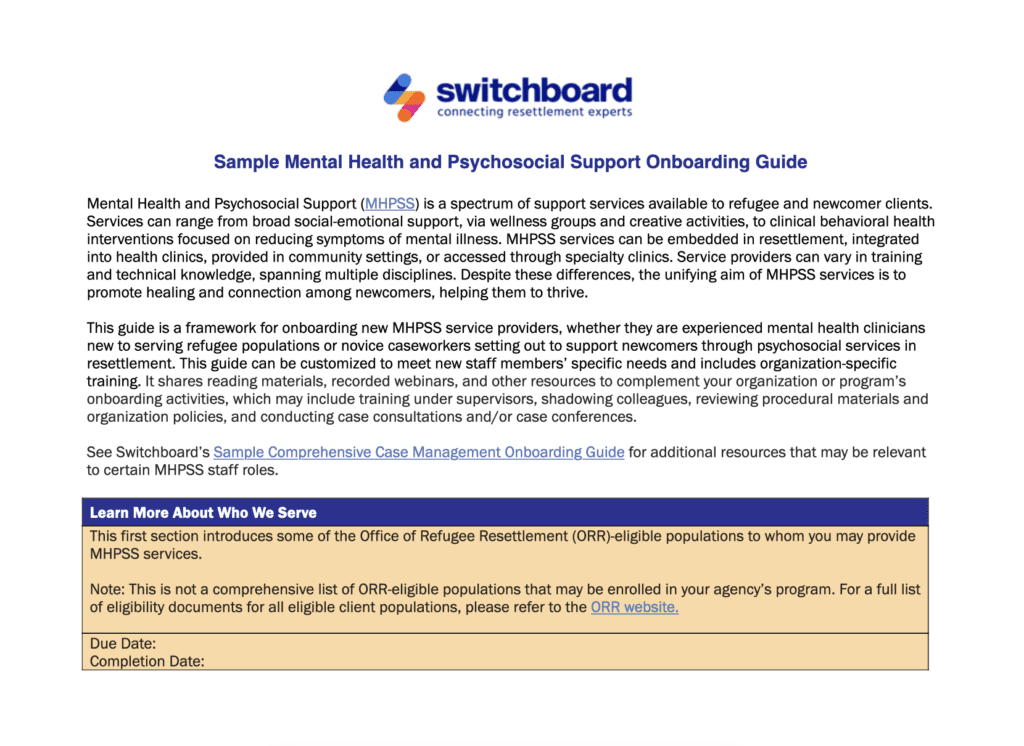 This guide is a framework for onboarding new MHPSS service providers, whether they are experienced mental health clinicians new to serving refugee populations or novice caseworkers setting out to support newcomers through psychosocial services in resettlement. This guide can be customized to meet new staff members’ specific needs and includes organization-specific training. It shares reading materials, recorded webinars, and other resources to complement your organization or program’s onboarding activities, which may include training under supervisors, shadowing colleagues, reviewing procedural materials and organization policies, and conducting case consultations and/or case conferences.