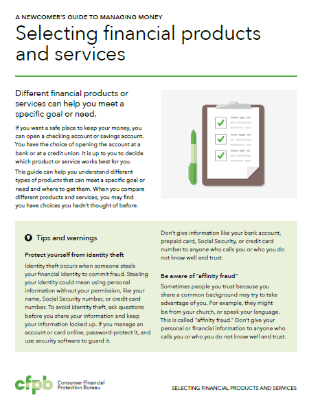 This guide provides information about different financial products or services that can help you meet a specific goal or need. This guide is part of the Consumer Financial Protection Bureau’s series on “A Newcomer’s Guide to Managing Money”.