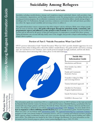 This guide introduces components that affect refugees risk for self-harm. While some refugee populations are more at risk than others, this guide navigates individual, family, community, and programmatic aspects pertaining to risk of suicide.