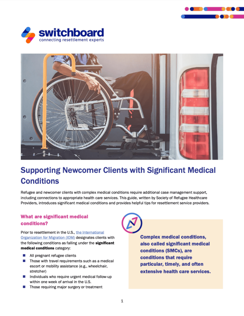 Refugee and newcomer clients with complex medical conditions require additional case management support, including connections to appropriate health care services. This guide, written by Society of Refugee Healthcare Providers, introduces significant medical conditions and provides helpful tips for resettlement service providers.