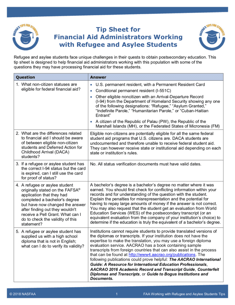 Refugee and asylee students face unique challenges in their quests to obtain postsecondary education. This tip sheet is designed to help financial aid administrators working with this population with some of the questions they may have processing the free application for federal student aid (FAFSA) for these students.