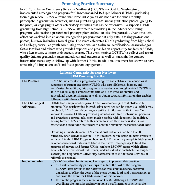 Lutheran Community Services Northwest (LCSNW) in Seattle, WA created an annual graduation recognition program for Unaccompanied Refugee Minors (URMs) graduating from high school or college. The program includes a formal gala; free professional photo portraits; an acknowledgement of foster families and others who provided support; and provides an opportunity for former URMs, who often return, to share their success stories. Through this program, LCSNW is able to collect and report quality data on graduate rates and education outcomes.