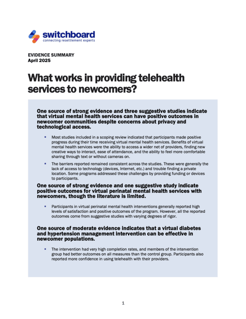 This resource, developed by Switchboard, summarizes the current evidence on providing telehealth services to newcomer communities. Drawing on strong and suggestive sources, the summary highlights that virtual mental health services can lead to positive outcomes for newcomers, despite challenges related to privacy and access to technology. It also finds that virtual perinatal mental health services and telehealth interventions for managing diabetes and hypertension show promising results. The summary discusses common barriers—such as digital literacy gaps, difficulty finding private spaces, and technological limitations—and offers practical recommendations for service providers.