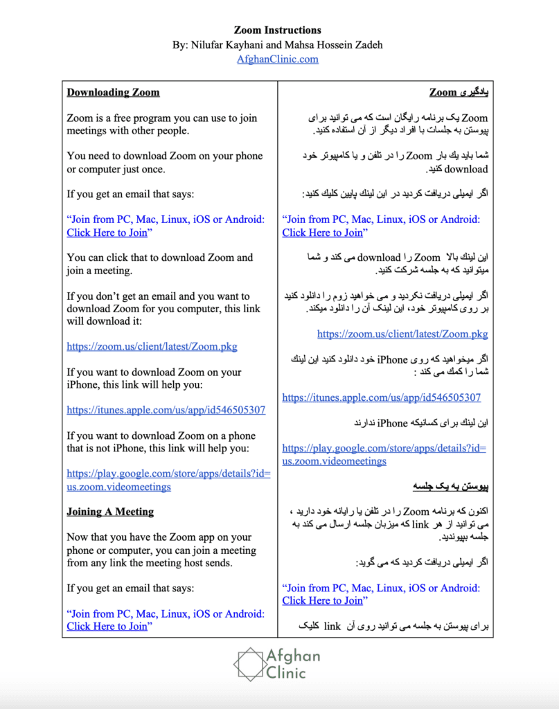 This resource, developed by Afghan Clinic, provides instructions on how to join a Zoom meeting. It is available in English and Dari.